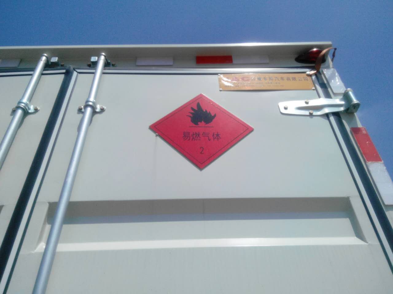運輸介質(zhì)為易燃?xì)怏w氣瓶,類項號為2.1;選裝帶液壓尾板,選裝不帶側(cè)門,側(cè)后防護(hù)材料為Q235A,螺栓連接,后防護(hù)截面尺寸(高×寬)為100mm×50mm,離地高度為424mm;選用危險品運輸車專用底盤,僅選用底盤子午線輪胎,ABS系統(tǒng)控制器型號:CM4YL,ABS系統(tǒng)控制器生產(chǎn)企業(yè):廣州市科密汽車制動技術(shù)開發(fā)有限公司,前輪安裝盤式制動器,安裝限速裝置,限速80km/h,排氣管前置,安裝具有衛(wèi)星定位功能的行駛記錄儀.僅選用底盤發(fā)動機HFC4DA1-2C和YC4FA115-40,對應(yīng)油耗值(L/100km)為12.7和12.5