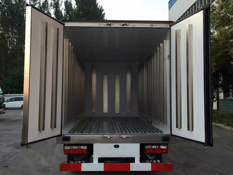 冷藏箱體尺寸長×寬×高為:4000X1880X1850,12.48立方,廂體厚度為8厘米。內(nèi)外板材采用冷藏車專用玻璃鋼,(可反射陽光),中間夾層為聚氨酯發(fā)泡隔熱材料,(防火阻燃隔熱)大型千噸壓力機(jī)壓制而成,配置箱體全為不銹鋼鎖件,不銹鋼包角,不銹鋼門框,帶有頂燈及防撞塊。我廠的冷藏保溫車保溫材料選用進(jìn)口級(jí)別XPS,吸水率≤1,導(dǎo)熱系數(shù)≤0.028W/mk,抗壓≥150Kpa,密度30~45kg/m3,使用國際上最為先進(jìn)的第五代全封閉聚氨酯板塊粘接結(jié)構(gòu),廂板表面材料有玻璃鋼、不銹鋼、鋁合金、彩鋼板等材料可供選擇,廂體成型后具有質(zhì)量輕,保溫系數(shù)高,抗沖擊力強(qiáng),無滲漏等優(yōu)點(diǎn),對大氣、水和酸、堿、鹽等介質(zhì)具有良好的耐腐蝕性和抗老化性。通過優(yōu)化設(shè)計(jì),降低了整車質(zhì)心,增大了有效容積。經(jīng)測試,整車綜合節(jié)能率,使用壽命,比一般冷藏保溫廂高1~2倍。