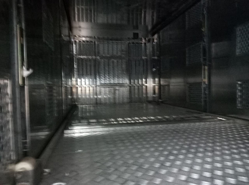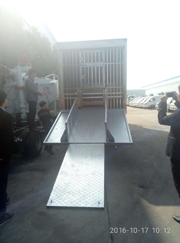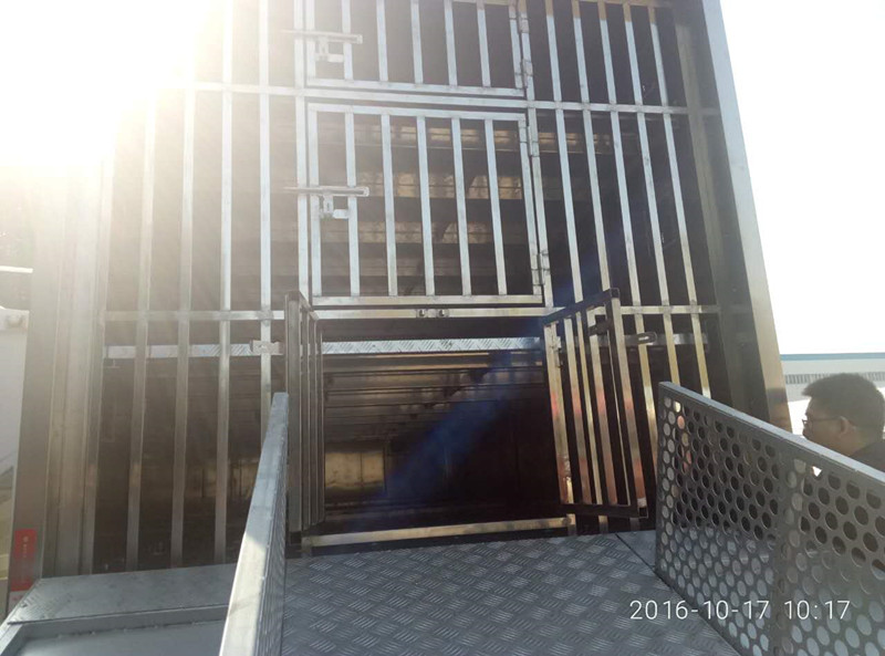 進(jìn)出通道:后門通過液壓系統(tǒng)自動展開形成仔豬進(jìn)出箱體的通道,設(shè)有護欄,方便仔豬上下.
