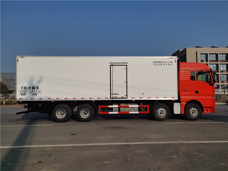 汕德卡自動(dòng)擋480馬力前四后八9米6冷藏車上裝配置:廂體內(nèi)尺寸9400x2450X2450(mm):斷橋隔熱工藝、整體結(jié)構(gòu)框架;內(nèi)外玻璃鋼板夾聚氨酯保溫層真空復(fù)合而成,底板為玻璃鋼板,箱體副駕駛邊開側(cè)門,地板加裝加厚矩形通風(fēng)槽,前后封口,龍骨斷橋?yàn)樗赡緩?fù)合板;木質(zhì)隔溫結(jié)構(gòu);廂體厚度為8cm;不銹鋼包角;最新款鋁合金包邊型材;廂體內(nèi)部安裝2個(gè)LED照明燈;后門框?yàn)?mm厚不銹鋼材質(zhì);門框密封條為橡膠材質(zhì);加厚型不銹鋼鉸鏈及鎖件;箱體內(nèi)部加裝5排肉鉤導(dǎo)軌,地板加裝加厚鋁合金通風(fēng)槽,200不不銹鋼肉鉤,安裝鄭州凱雪1090非獨(dú)立制冷機(jī)組。最低溫度可達(dá)-18度。