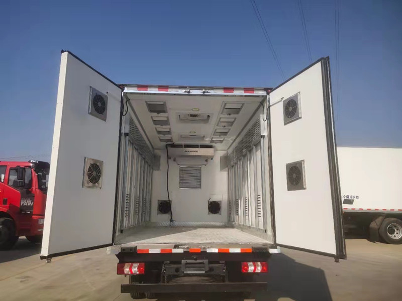 柳汽乘龍藍牌4米2雞苗運輸車雞苗箱體內(nèi)部專用配置:【恒溫設(shè)備】凱利制冷機組,水暖加熱;【通風設(shè)備】廂體兩側(cè)外部可開啟通風窗口共8個;頂部開開啟排氣天窗2支,排氣扇4支,尾門排氣扇4支,廂體上部兩側(cè)通風道。地板鋁花紋通風道?!痉D(zhuǎn)貨架】廂體兩側(cè)手動翻轉(zhuǎn)堆貨貨架;【供電設(shè)備】直流柴油發(fā)電機(排氣扇供電),【溫濕度記錄儀】溫度,濕度監(jiān)測。安裝雙溫制冷機組,夏天制冷,冬天加熱。