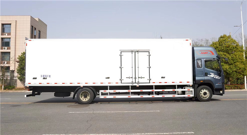 解放JK6大單橋高性價比的黃牌9米6冷藏車專用配置:箱體尺寸:9650×2420×2500(mm),《斷橋隔溫工藝、整體結構框架》;內外面料為3mm新款玻璃鋼;側板+頂板:龍骨斷橋為松木復合板;木質隔溫結構;夾心為聚苯乙烯保溫材料;全密封雙組合聚氨酯膠粘連;廂體厚度為8cm;頂板250px厚,底板300px厚,鍍鋅包角;最新款鋁合金包邊型材;型材局部厚度為4mm(鋼制鉚釘加固);廂體內部采用2個LED照明燈及廂體示寬燈;后門框為3mm厚不銹鋼材質;門框密封條為三元乙丙橡膠材質;加厚型不銹鋼合頁及鎖件;副梁為Q700車用大梁鋼;15mm厚大梁墊皮;加裝防撞膠塊;不銹鋼門鎖件,配后雙開門。底板為玻璃鋼,單側門。