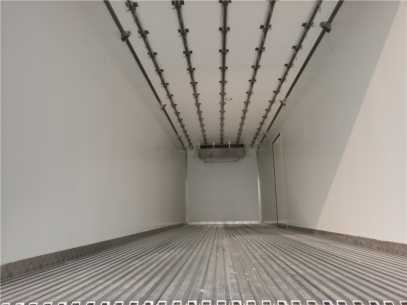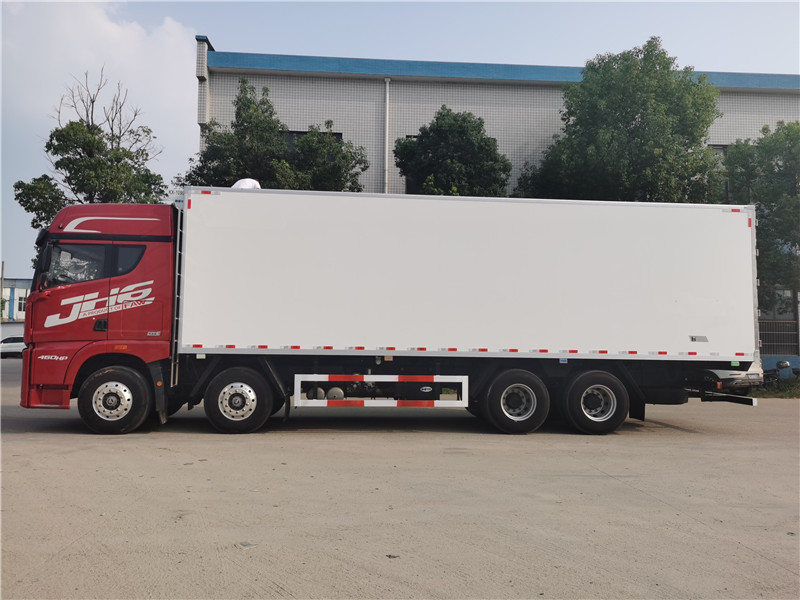 一汽解放JH6 460馬力前四后八9米6冷藏車標準配置: 冷藏廂體內(nèi)尺寸9400x2430X2480(mm),內(nèi)部空間約56.6方,廂體配置:斷橋隔熱工藝、整體結(jié)構(gòu)框架;內(nèi)外玻璃鋼板夾聚氨酯保溫層真空復(fù)合而成,底板為鋁花紋板,龍骨斷橋為松木復(fù)合板;木質(zhì)隔溫結(jié)構(gòu);廂體厚度為8cm;不銹鋼包角;最新款鋁合金包邊型材;廂體內(nèi)部采用3個LED照明燈;后門框為2mm厚不銹鋼材質(zhì);門框密封條為橡膠材質(zhì);加厚型不銹鋼鉸鏈及鎖件;副駕駛邊開雙開門(選開單側(cè)門),廂體四周加裝鋁花紋板,廂體頂部加裝5排肉鉤導(dǎo)軌,廂體地板加裝鋁合金通風(fēng)槽,可拆卸防護網(wǎng),加裝檢修爬梯。制冷機組采用凱雪1090超薄制冷設(shè)備,可選裝進口開利或冷王獨立制冷機組。