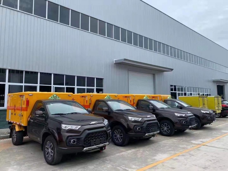 江鈴域虎四驅(qū)國(guó)六皮卡防爆車在運(yùn)輸爆破品是必須按照公安部門核發(fā)的道路通行證指定的時(shí)間、路線行駛。運(yùn)輸過程中發(fā)生火災(zāi)時(shí),應(yīng)盡可能將爆炸品轉(zhuǎn)移到危害最小的區(qū)域或進(jìn)行有效隔離。不能轉(zhuǎn)移、隔離時(shí),應(yīng)組織人員疏散。施救人員應(yīng)戴防毒面具。撲救時(shí)禁止用沙土等物壓蓋,不得使用酸堿滅火劑。車廂裝貨總高度不得超過 1.5 米。無外包裝的金屬桶只能單層擺放,以免壓力過大或撞擊摩擦引起爆炸。凡從 1.5m 以上高度跌落或經(jīng)過強(qiáng)烈震動(dòng)的爆炸品等應(yīng)單獨(dú)存放,未經(jīng)鑒定不得裝車運(yùn)輸。任何情況下,爆炸品不得配裝,裝運(yùn)雷管和炸藥的兩車不得同時(shí)在同一場(chǎng)地進(jìn)行裝卸。嚴(yán)禁接觸明火和高溫,嚴(yán)禁使用會(huì)產(chǎn)生火花的工具、機(jī)具。