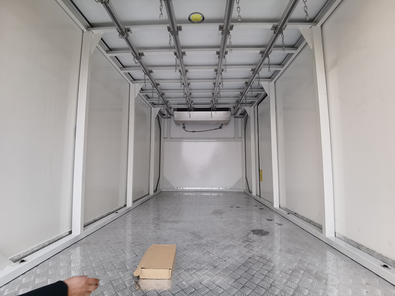 五十鈴KV100藍牌可拆卸肉鉤冷藏車副梁為Q700車用大梁鋼(副梁采用噴粉工藝,金屬表面物理化拋丸處理;結(jié)晶體皮處理;靜電粉體涂裝;熱固化200-220℃高溫烘烤;常溫冷卻。耐酸耐堿耐腐蝕);15mm厚大梁墊皮;加裝防撞膠塊;不銹鋼門鎖件,配后雙開門。箱體內(nèi)部選裝可拆卸式肉鉤導軌,底板選裝通風槽,選裝溫濕度記錄儀,選裝國產(chǎn)、進口冷凍制冷機組,最低溫度可達-15度,可根據(jù)需求進行調(diào)節(jié)。
